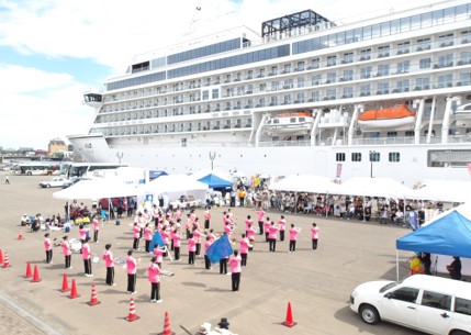 飛鳥Ⅲの入港を記念しイベントを開催!天候にも恵まれ青空の元、飛鳥Ⅲの乗客はもとより多くの市民が会場を訪れました。