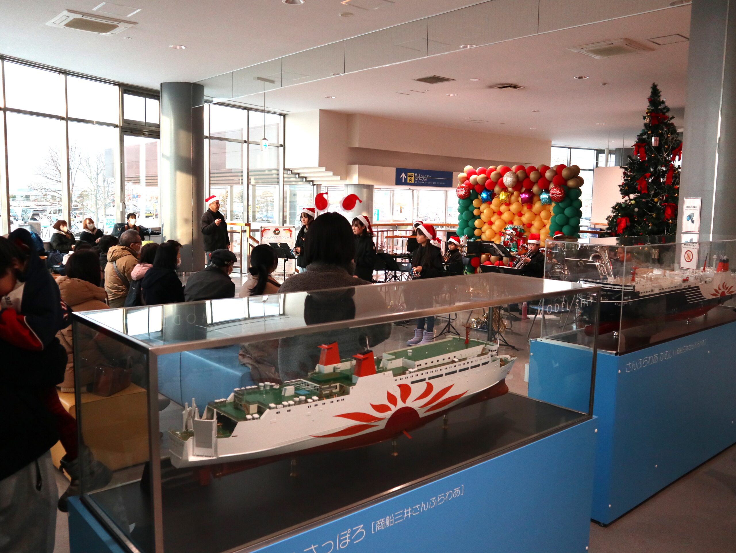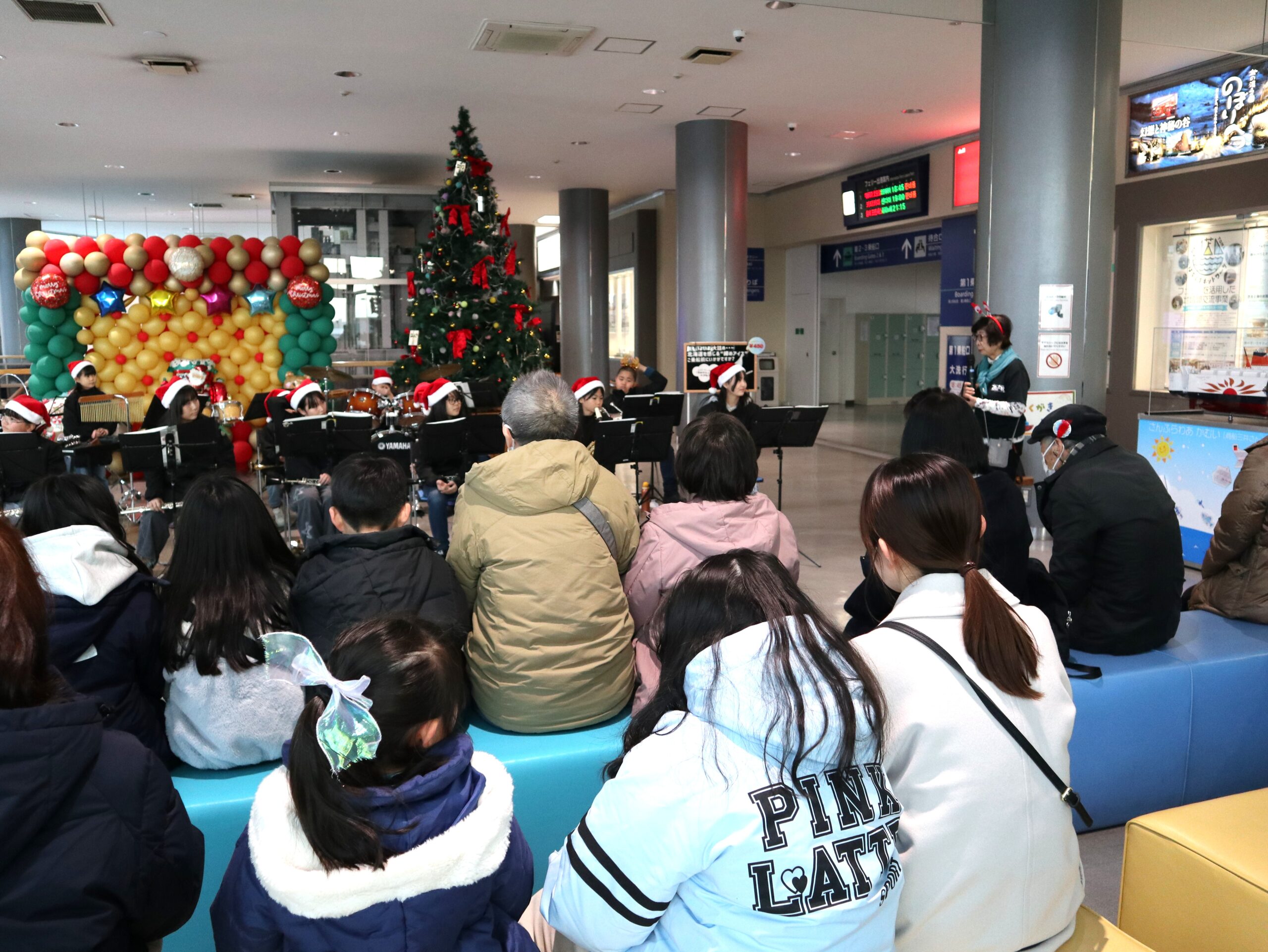 苫小牧西港フェリーターミナルにおいて、小学生バンド「苫小牧ユースウィンズ」によるクリスマスコンサートを開催しました。子どもたちはサンタクロースの帽子やトナカイのような飾りを身に着け、約30分にわたり演奏。また、曲に合わせ歌ったり踊ったり会場を盛り上げました。フェリー乗船客や関係者約60人がクリスマス気分を満喫しました。