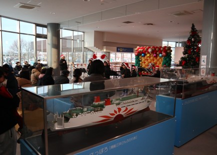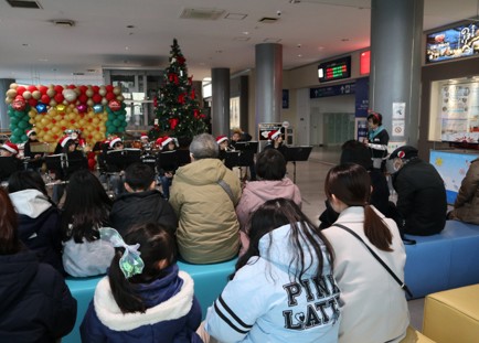 苫小牧西港フェリーターミナルにおいて、小学生バンド「苫小牧ユースウィンズ」によるクリスマスコンサートを開催しました。子どもたちはサンタクロースの帽子やトナカイのような飾りを身に着け、約30分にわたり演奏。また、曲に合わせ歌ったり踊ったり会場を盛り上げました。フェリー乗船客や関係者約60人がクリスマス気分を満喫しました。