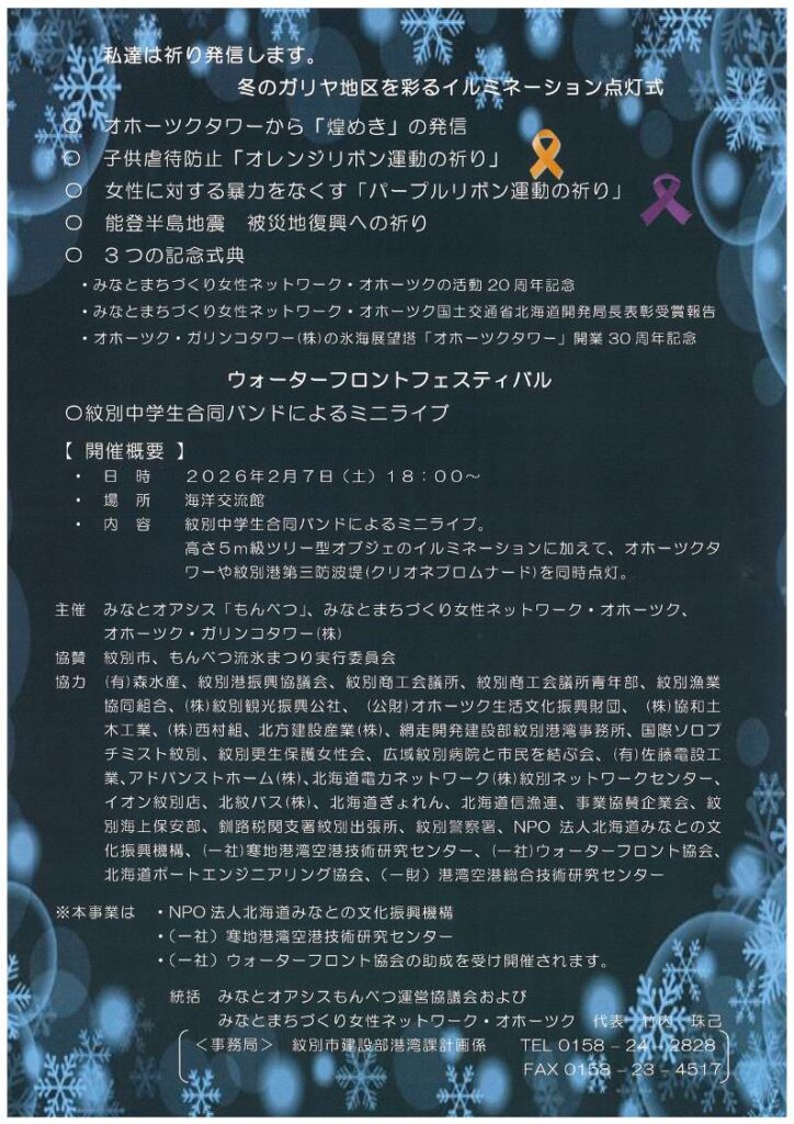 イルミネーション点灯式開催日時2026年2月7日(土)18時~会場紋別市海洋公園ガリヤ地区イベント広場※ミニライブは海洋交流館主催みなとオアシス「もんべつ」、みなとまち…